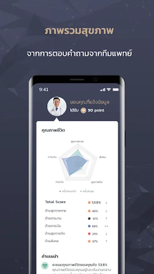• Evaluate quality of life by analyzing your data based on Well Health database, and reveal your overall health condition if any irregularities found or the risks of developing diseases caused by health behaviors or Non-communicable diseases (NCDs).