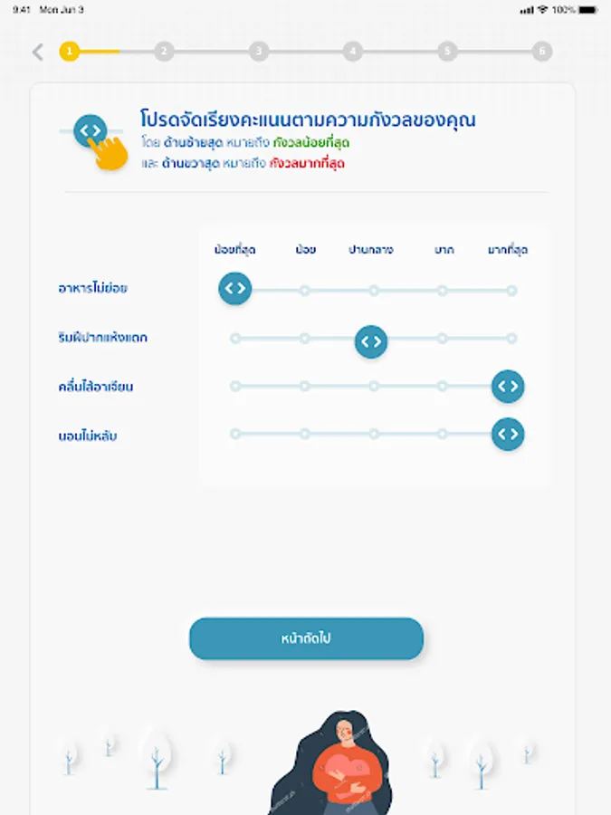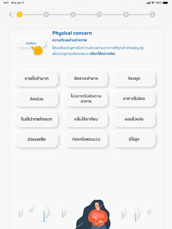 หากผู้ป่วยมีอาการบางอย่างสามารถระบุอาการและให้คะแนนอาการนั้นได้ โดยที่แอปพลิเคชันจะบันทึกและสรุปอาการทั้งหมดเพื่อรายงานต่อผู้ดูแลและเจ้าหน้าที่ทางการแพทย์ต่อไป
