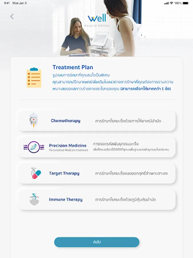 แพลตฟอร์มที่ให้คุณหมอ พยาบาล เภสัชกร ได้ติดตามดูแลผู้ป่วยระหว่างการรักษาและหลังการรักษา โดยไม่ได้ติดตามแค่อาการผลข้างเคียงทางร่างกายเท่านั้นแต่ Well Care ยังใส่ใจบริบทชีวิตของผู้ป่วยในทุกๆด้าน