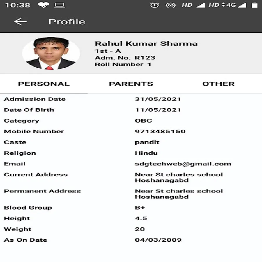 6. Profile of the student with option to edit details.