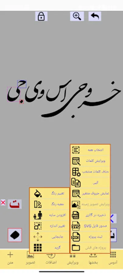 2-تغییر حروف به شکلهای مختلف و کشیدن و اتصال حروف با استفاده از ابزار قرار داده شده در برنامه