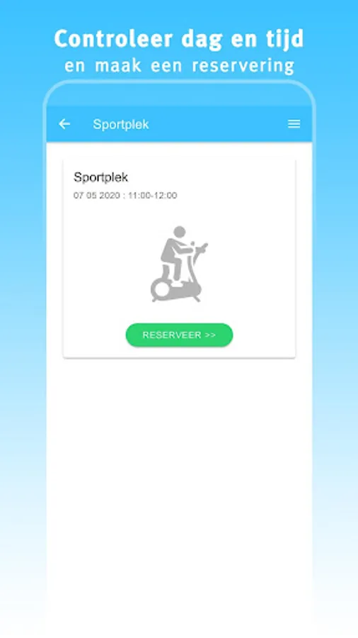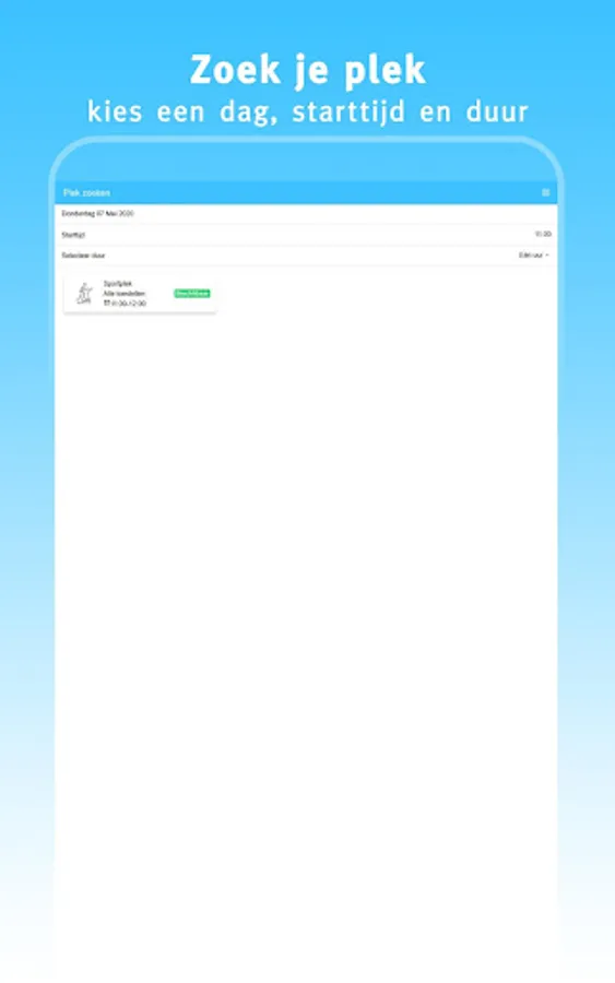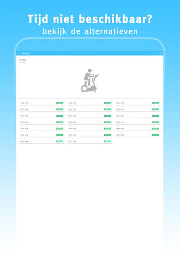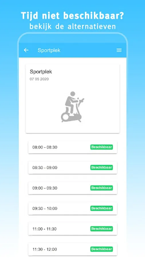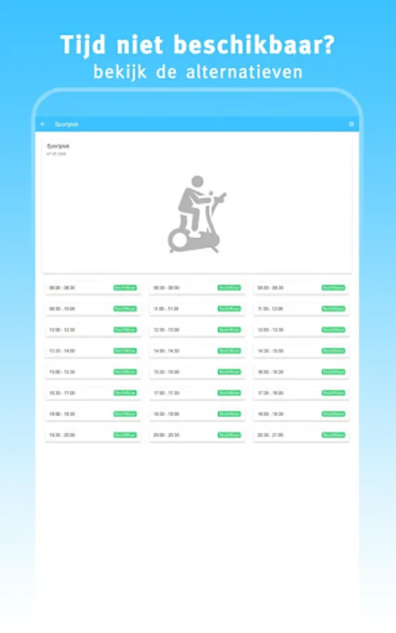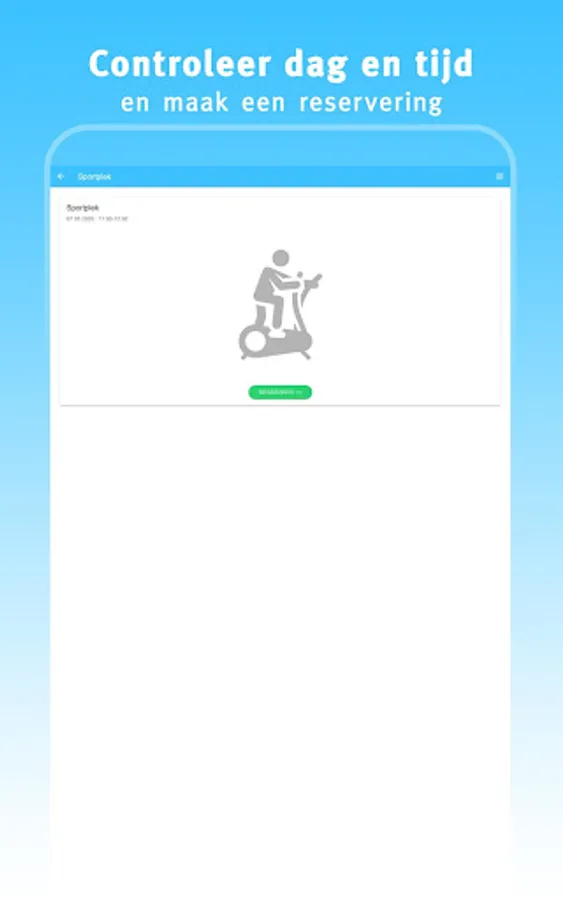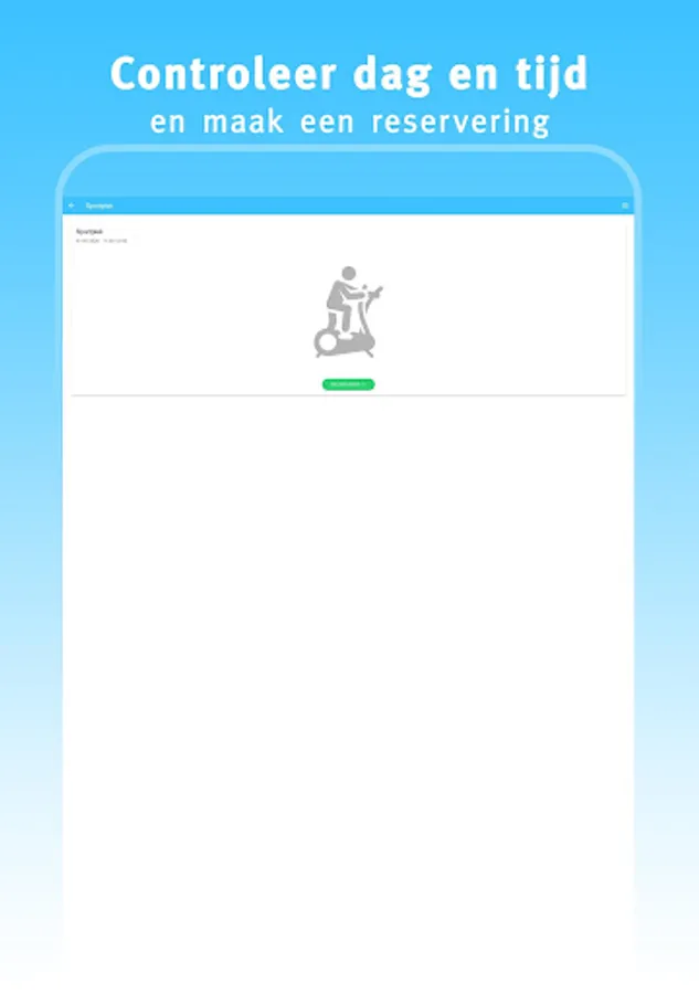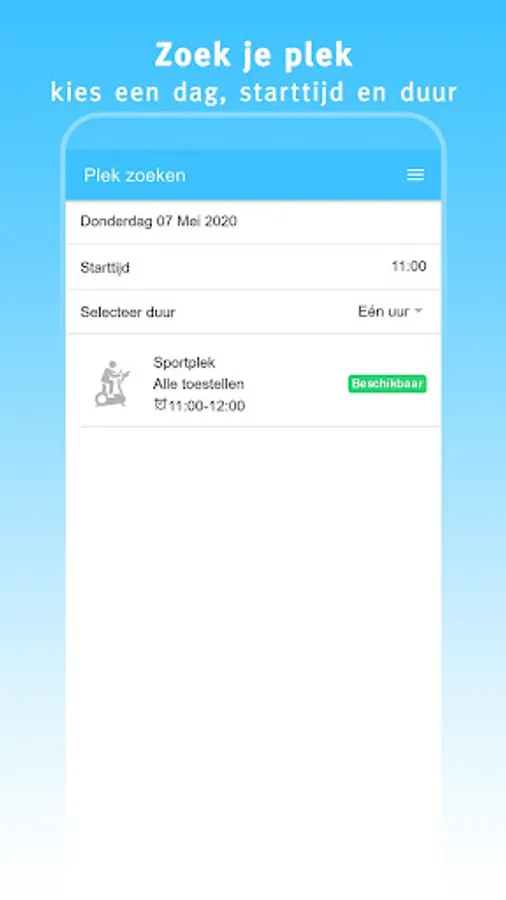 This app 'My gym' offers you the possibility to quickly and easily find and book a sports place at your gym. Choose a day, start time and duration. If the desired time slot is available, you can immediately reserve your spot.