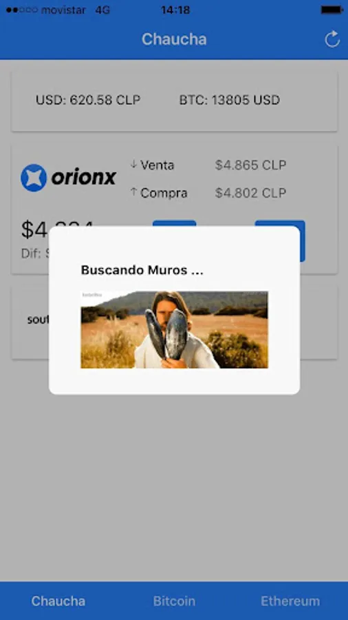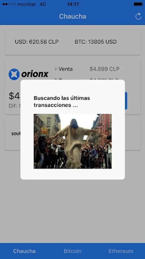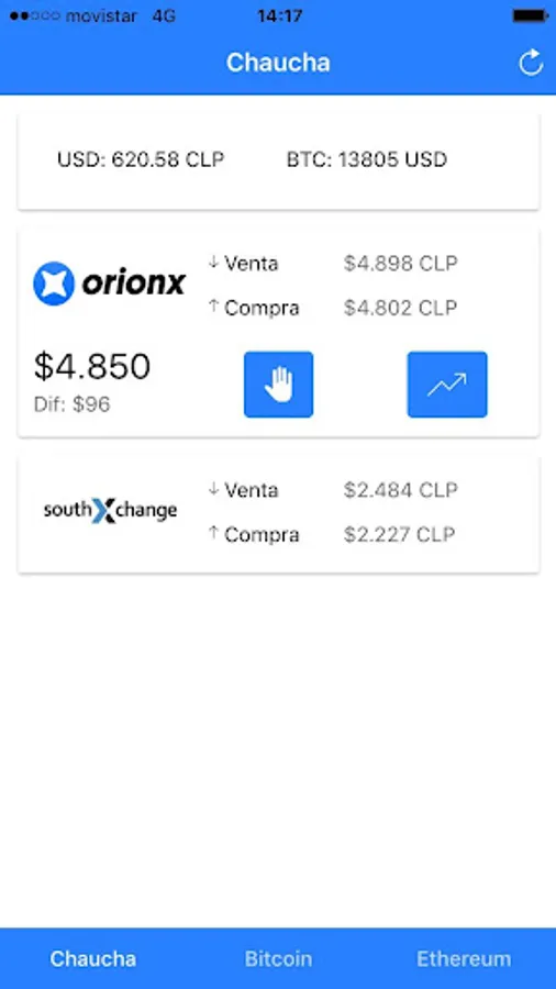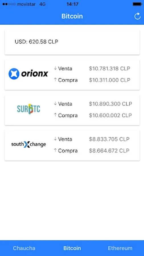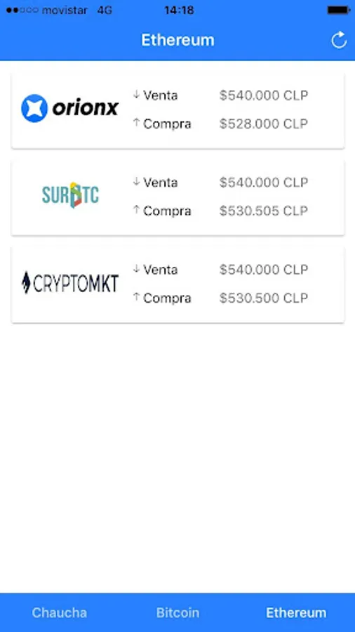 Check the value of the cryptomedas of different exchange in only one app. Jesucrypto communicates with OrionX, Buda, Bitinka, CryptoMKT and Southxchange. It possesses information of Bitcoin and Ethereum, in addition to the Chilean Cryptomonedas Chaucha and Luka