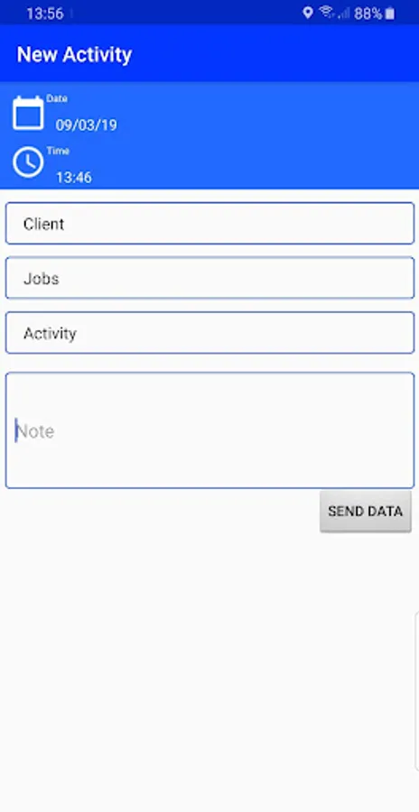 3. Entry of the Date / Time, selection of the Customer, related Work, Type of activity and Optional additional note.