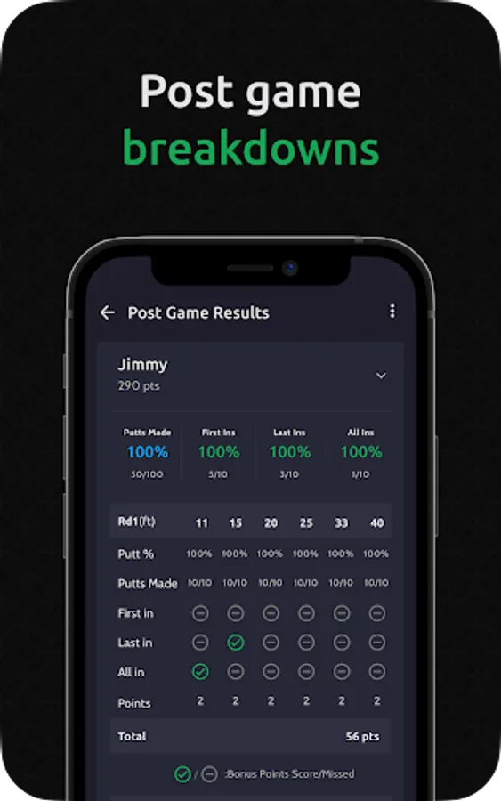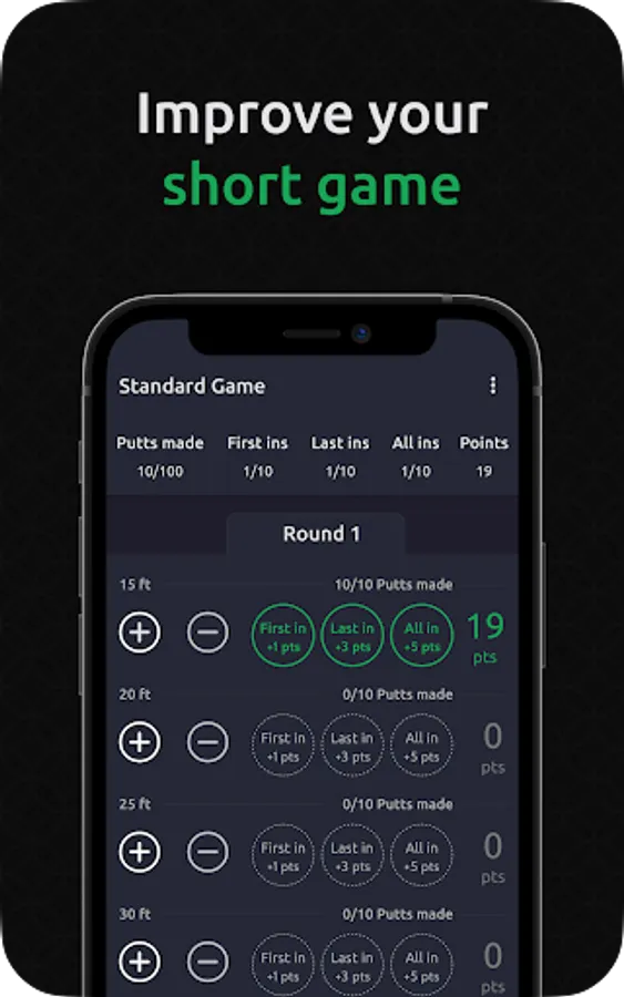 Play a Standard game of Just Putt where you can log your Putts Made, First Ins, Last Ins and All ins.