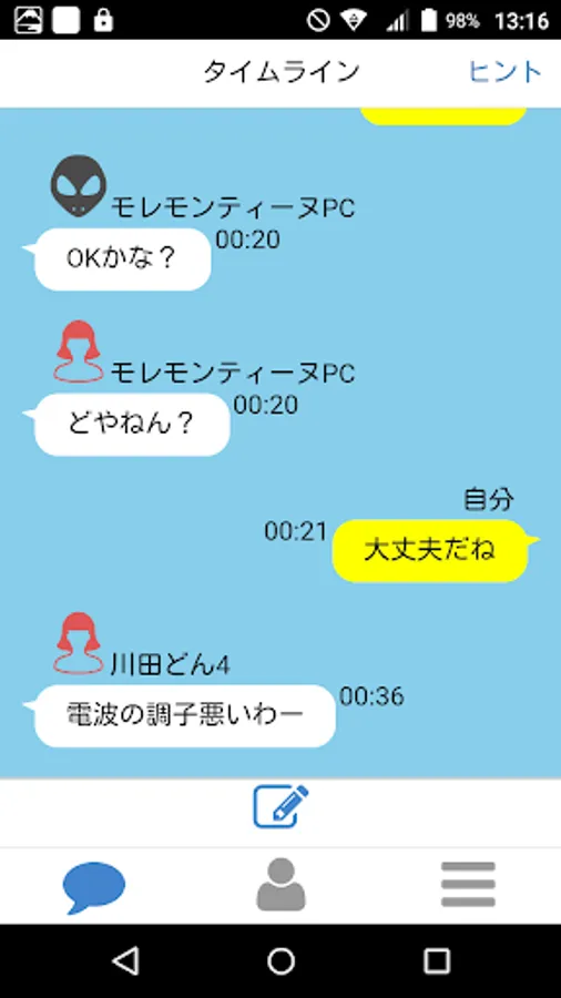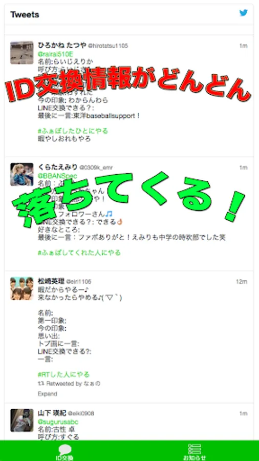 タイムラインに某有名トークアプリの「緑」や「黄色」や青い鳥のアイコンのID、ネタ、つぶやきなどを投稿してみんなの気を引きます。