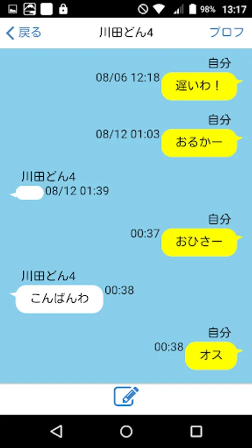 ここに他のメッセージアプリ(「緑」や「黄色」や青い鳥のアイコンのアプリ)のIDを貼ってもよし。ネタを貼ってもよし。