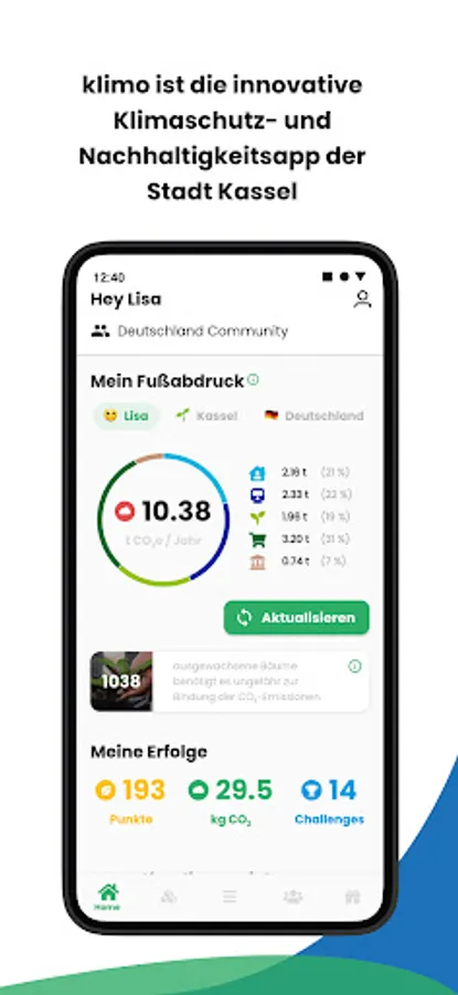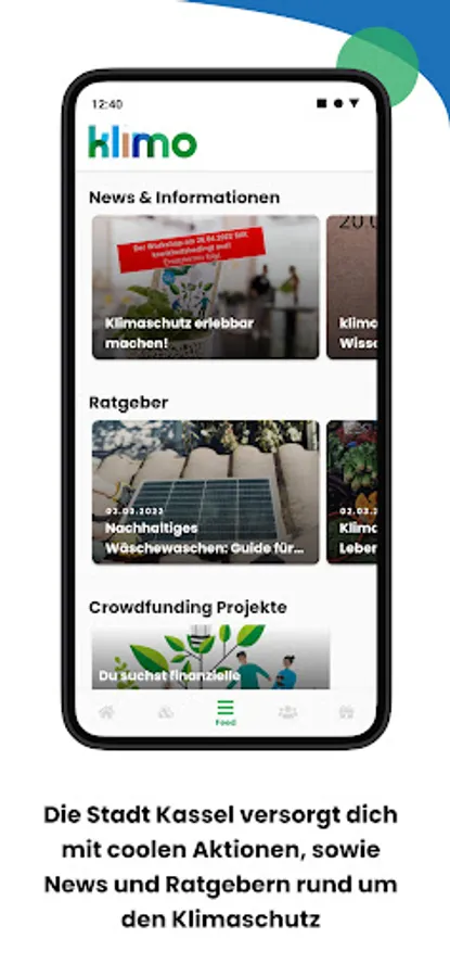 klimo is an app that helps you to sustainably advance climate protection in your city and reduce your CO2 emissions. With klimo you can calculate your footprint, update it and reduce it bit by bit with the help of challenges. Sustainable projects encourage you to support regional climate protection and to get closer to climate neutrality. The focus of the app is initially on the city of Kassel.