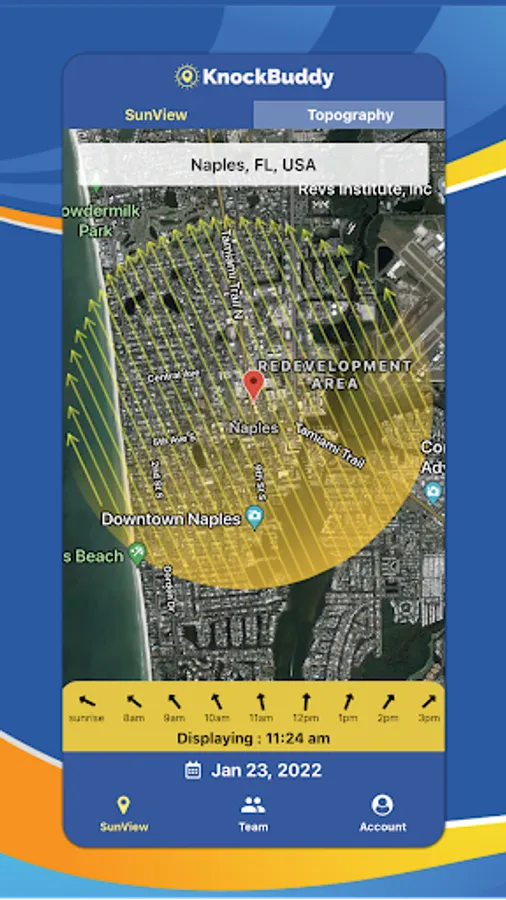 Map settings in satellite SunView or in Topography; Use the display to predict and see an area's exposure by direction of the sun using the Sun's Locations, Solar Path, and Geographic locating Knockbuddy is able to show you what direction Sun rays hit a location.