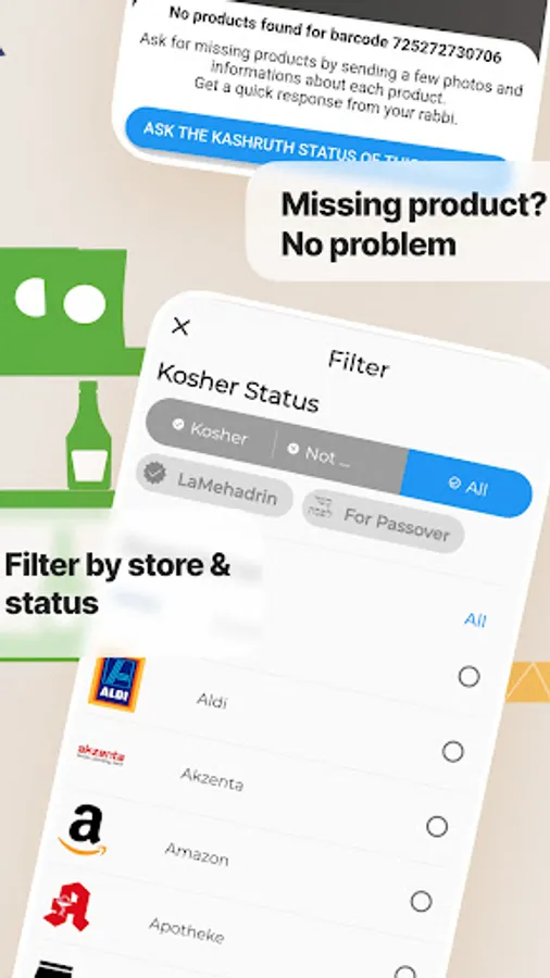 If a product is missing just ask your rabbi by taking a few pictures and entering product informations. It’s that easy!