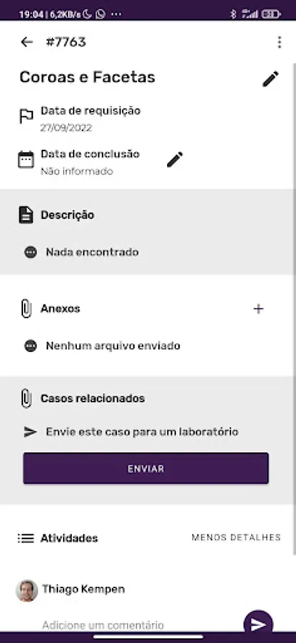 You can attach STL files, photos, videos, audios, comment on what is happening with the work, define a responsible member and even use the internal chat, eliminating the team's famous Whatsapp Group.