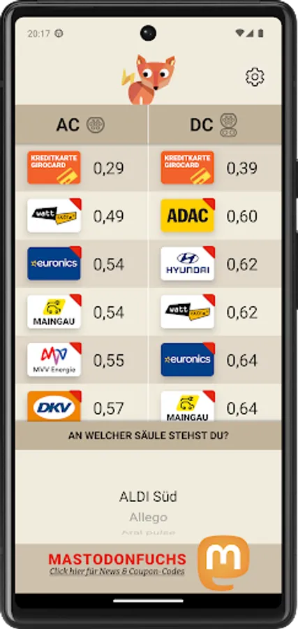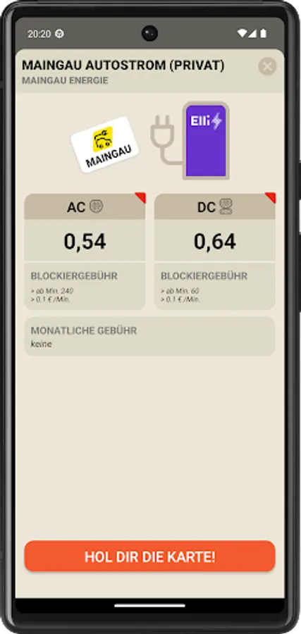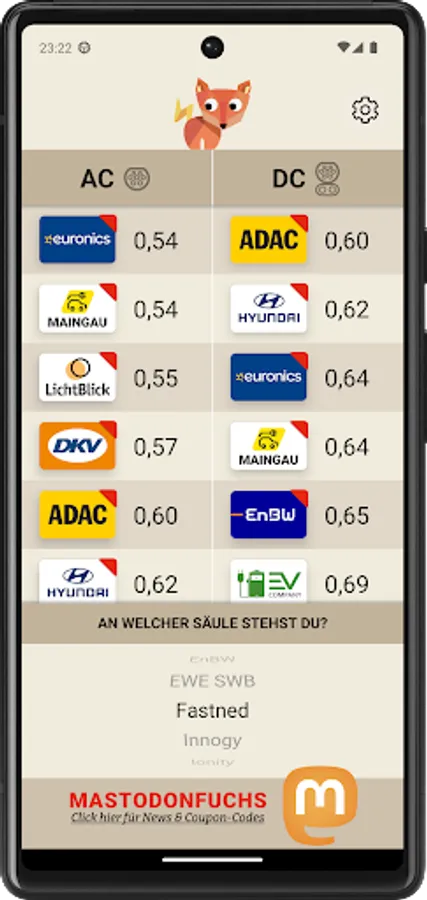 With a swipe of your finger, the charging fox shows you the cheapest charging card at the EV charging station.