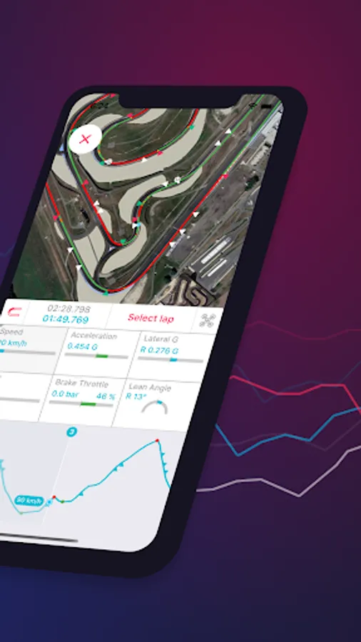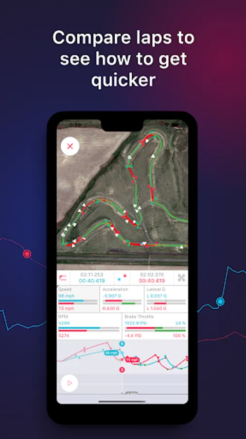 - Visualize the lines and analyze each lap to see why you’ve been fast or slow in a particular part of the track. You can analyze speed, acceleration or deceleration, lateral Gs, RPMs, gear change, throttle and brake application, temperatures for go-karts and lean angles for motorcycles as well as your line on the map.