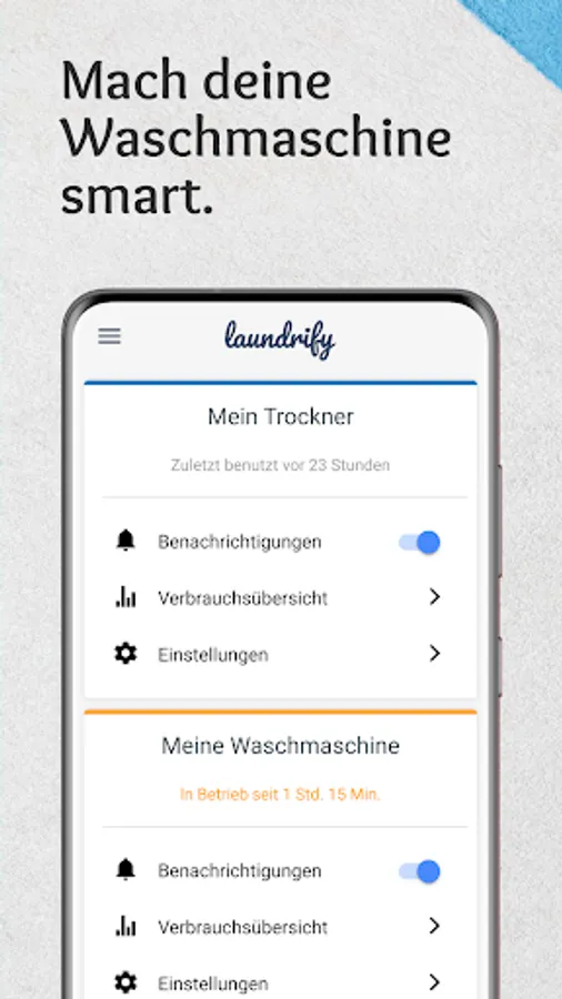 In the laundrify app you can view the status of the current wash at any time and be notified by push notification on your smartphone as soon as the laundry is ready.