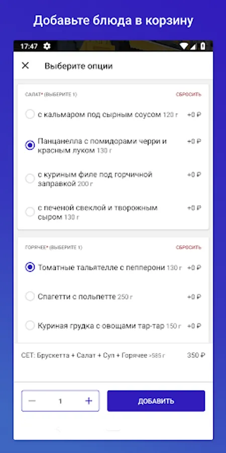 3. Examine the menu and select dishes. Meals are added to the general basket of the group.