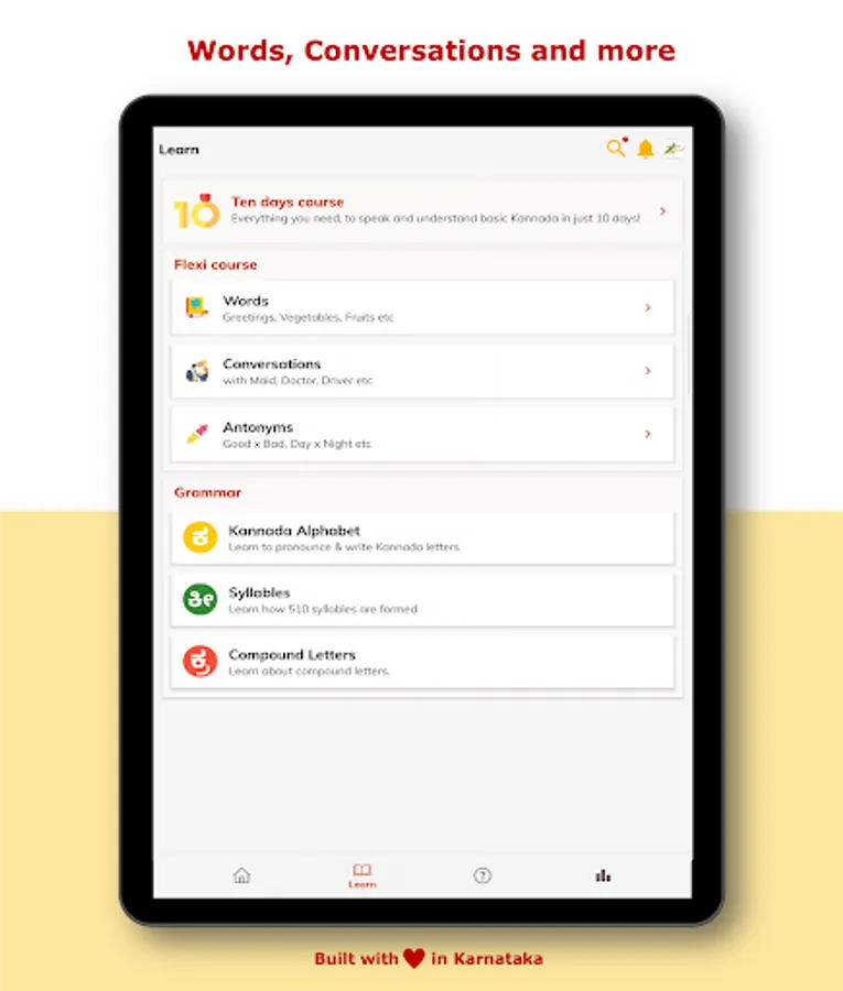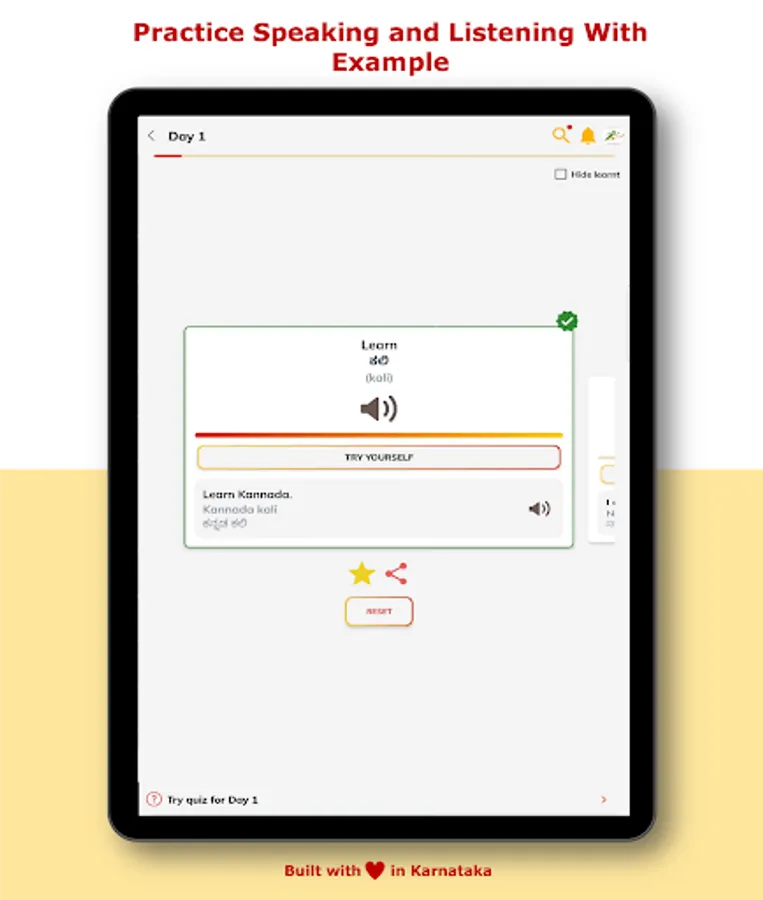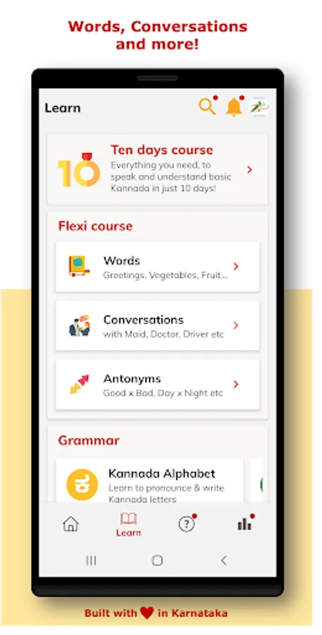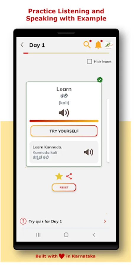 10 days course where a user can learn basic spoken Kannada with an example sentence for each word, everything with audio!
