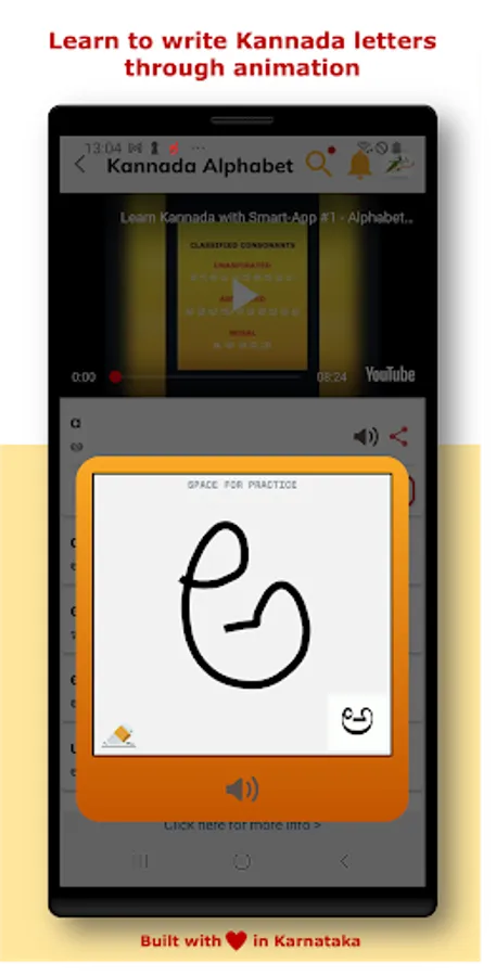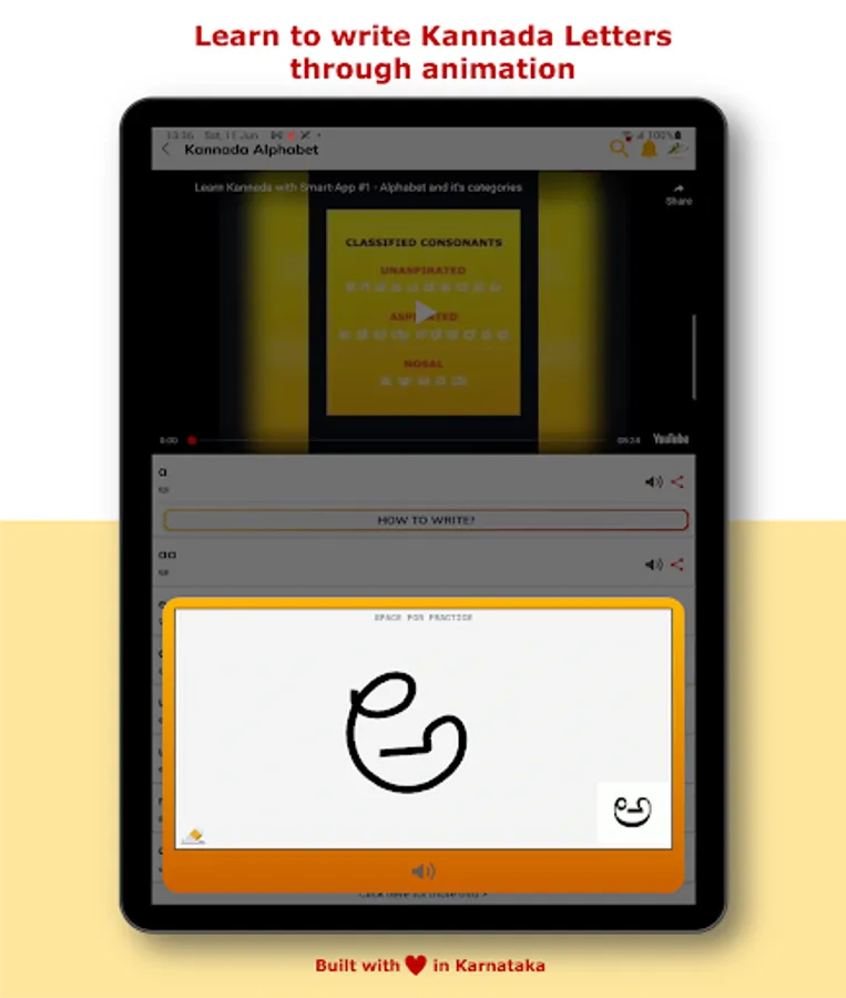 a. Alphabet - Learn Kannada Alphabet pronunciation and also learn how to write it. The user will have a dedicated screen to practice writing.