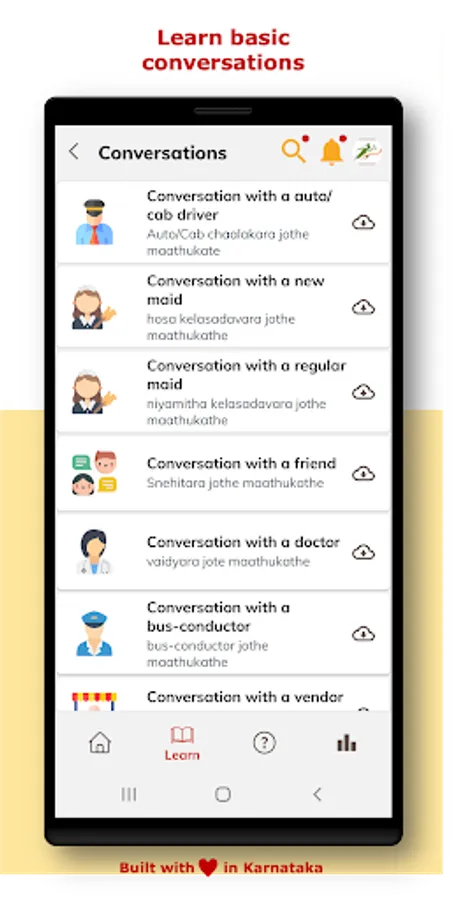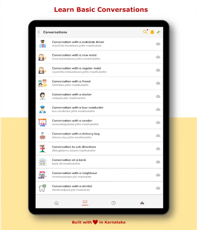 c. Conversations - Learn basic conversations required. Example: Conversation with a maid, Conversation with the auto driver etc.