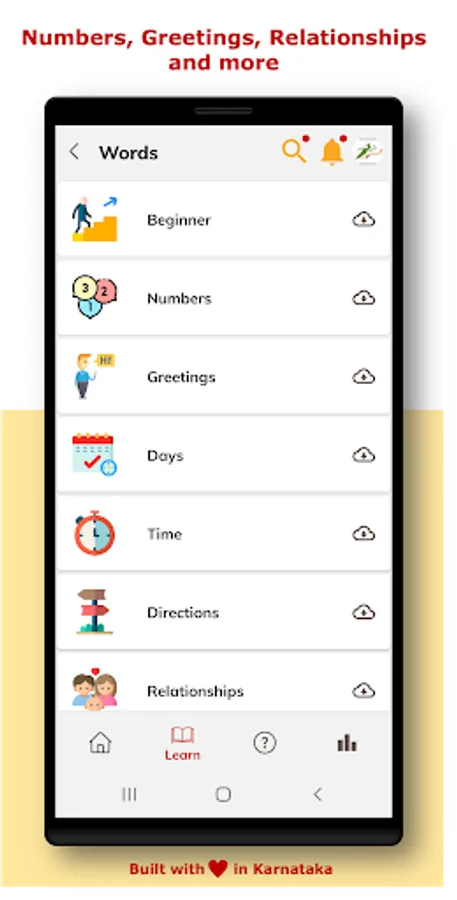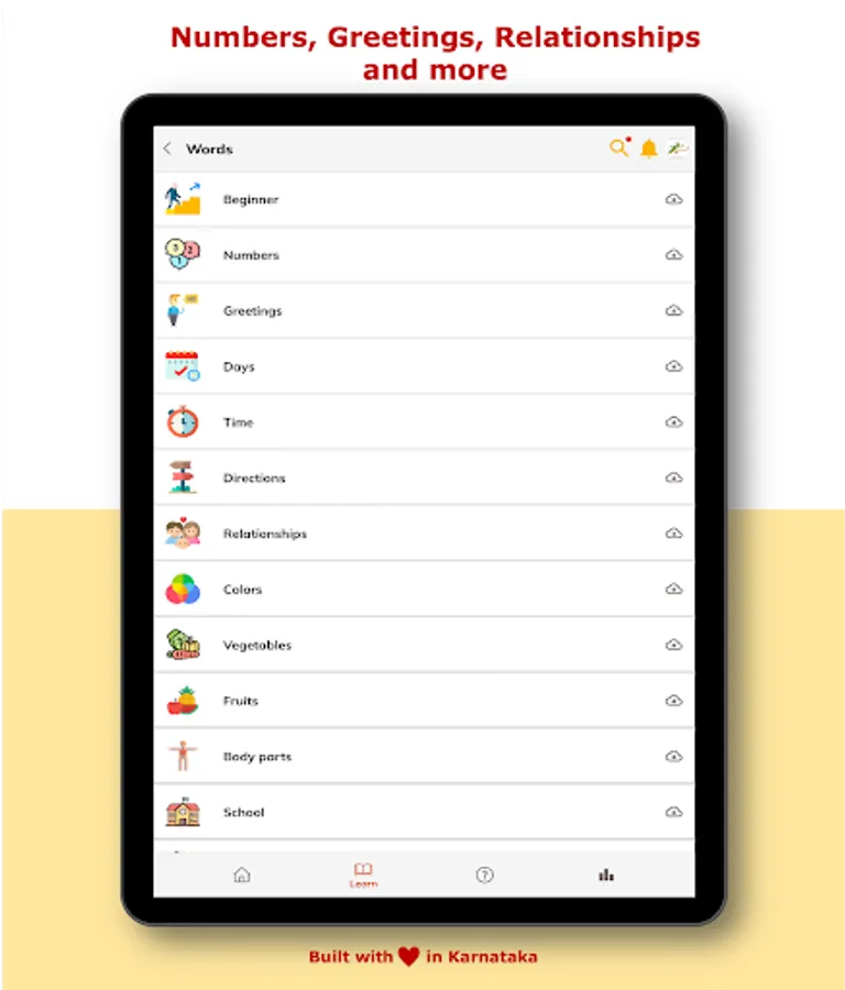 b. Words - Learn words in Kannada Categories wise Example: Basics, Numbers, Alphabets, Vegetables, Fruits etc.