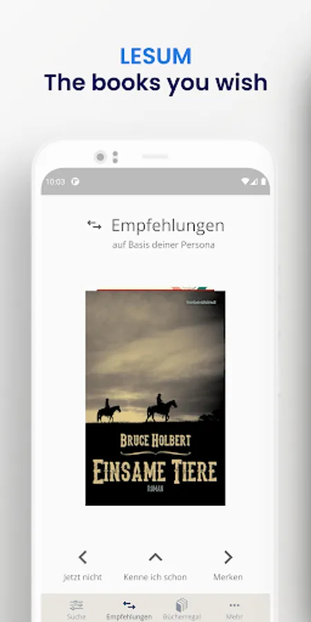 Discover books that perfectly suit your personal reader type! Whether peformer: in, romantic: in, thoroughbred literary man: in or or or ...: LESUM recommends books that exactly match your reading taste. As if you were in a really good bookstore - only that thanks to dual intelligence (man and machine), LESUM knows and can suggest a lot more books than any: r bookseller: in! Be inspired by LESUM, search with filters for yourself or friends: find out more about books you might like - and just have fun by selecting books according to the Tinder principle. And LESUM is sustainable: You can buy new books, but also used ones - or you can borrow them from your city library! You decide for yourself, we open all paths for you.