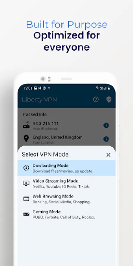 Liberty VPN offers four different VPN modes to cater to your specific needs: Gaming Mode, Streaming Mode, Downloading Mode, and Web Browsing Mode. Whether you're playing online multiplayer games, streaming videos, downloading files, or browsing the web, Liberty VPN has got you covered.