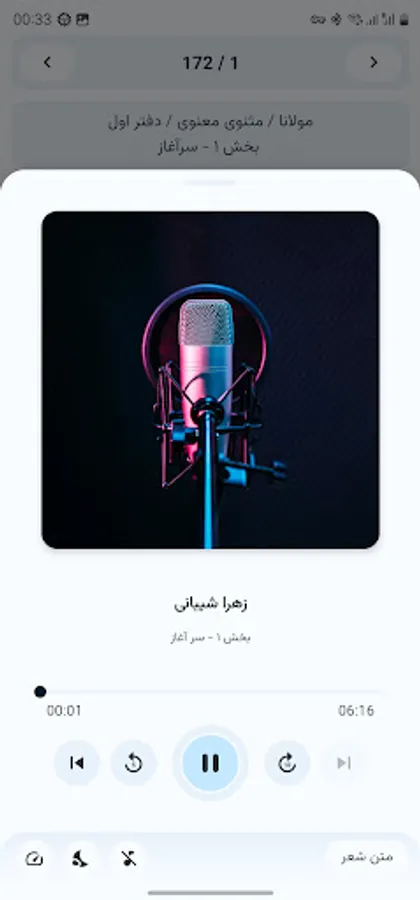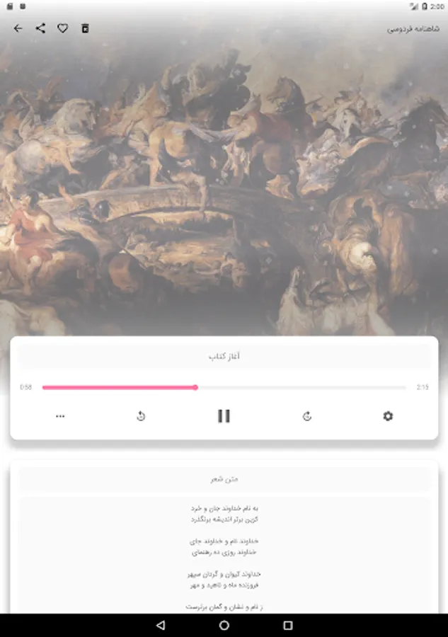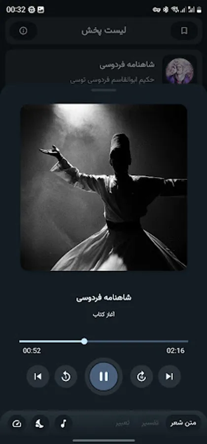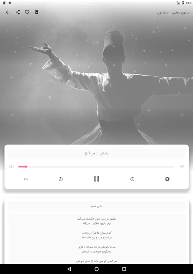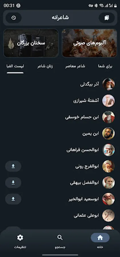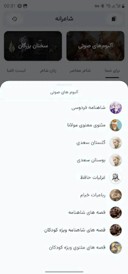 In the section of your audio albums, which was the main part of the initial version of the software, you have full access to audio poems, and we tried to add all the poet's poems to the app in order and carefully based on complete albums, and you can add all the poems without Listen and download intermittently and consecutively, and with the help of the new music player, you have complete access to the necessary facilities.