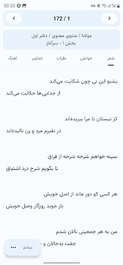And on the other hand, on the page of each poem, you have full access to the facilities. You can have the text of the poem, audio readings, user comments, images of the poems and related songs together, and also you have additional features such as selecting and sharing the text, weighted format and more explanations, as well as sharing photos of the poems and other things. You need access.