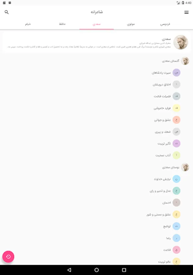 This section is categorized based on the popularity of poets and you can access the poems of great poets such as Ferdowsi, Saadi Hafez and other poets such as Maulana and Khayyam and other poets.