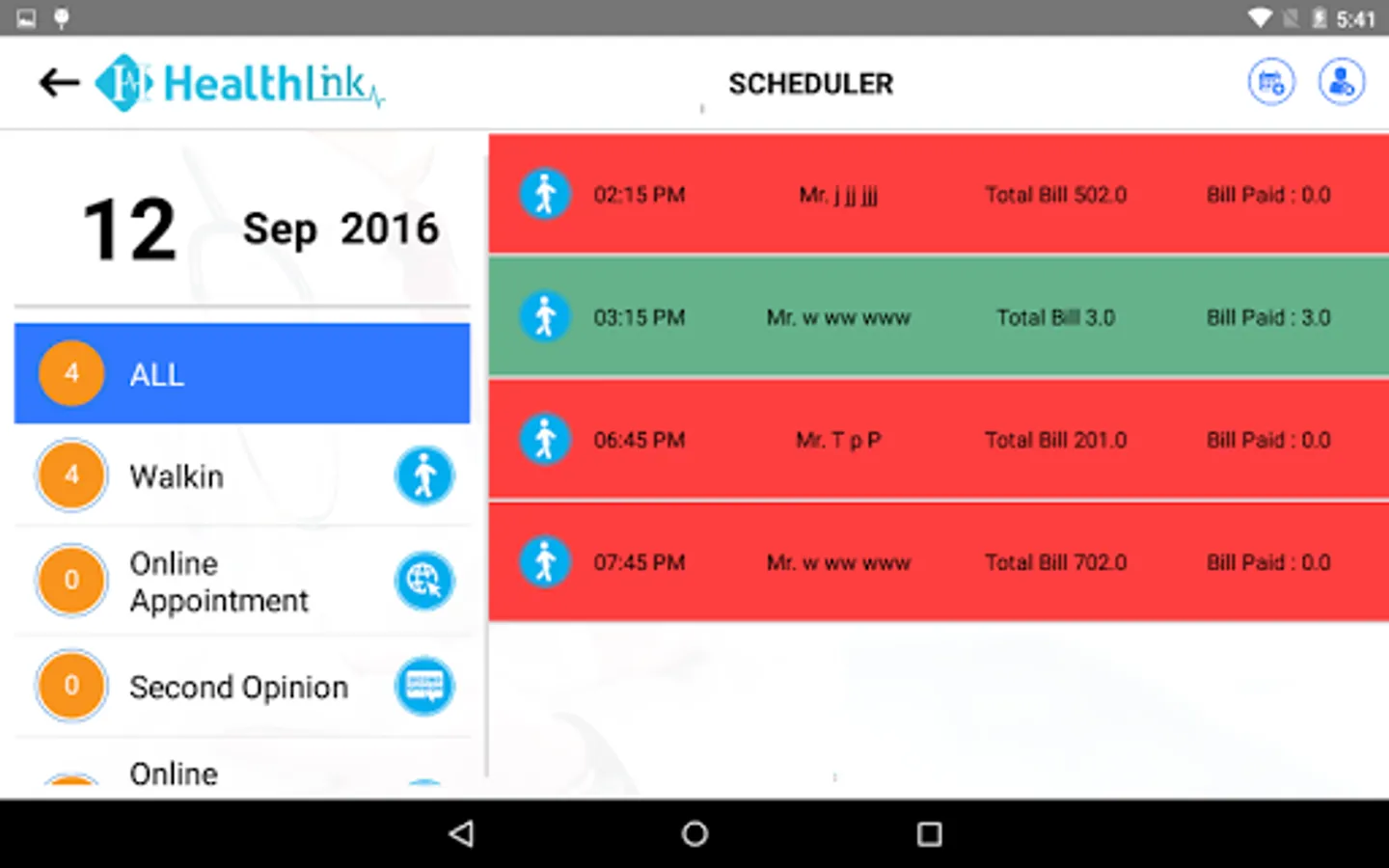 HealthLink’s scheduler module allows you to track all appointments for defined period and plan your activities accordingly. You can view the appointments booked by the patients using HealthLink’s mobile application or manually records future appointments through the system .