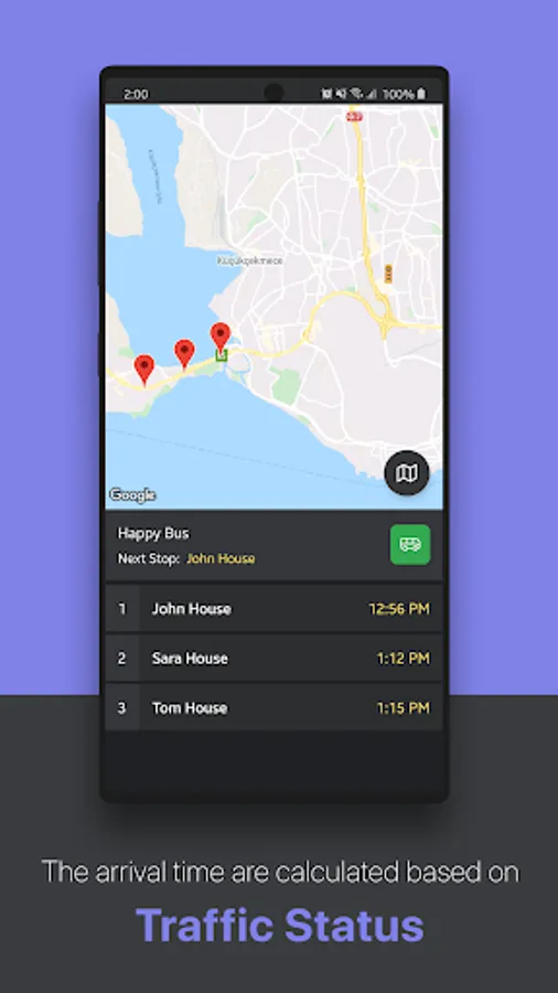 The arrival times are calculated based On real-time traffic changes.. never wait or miss the bus