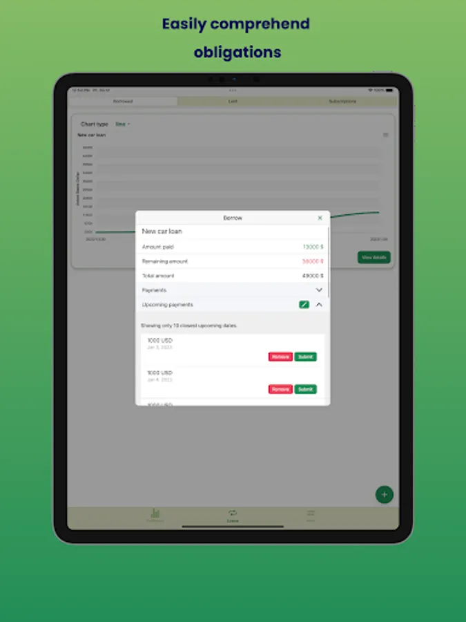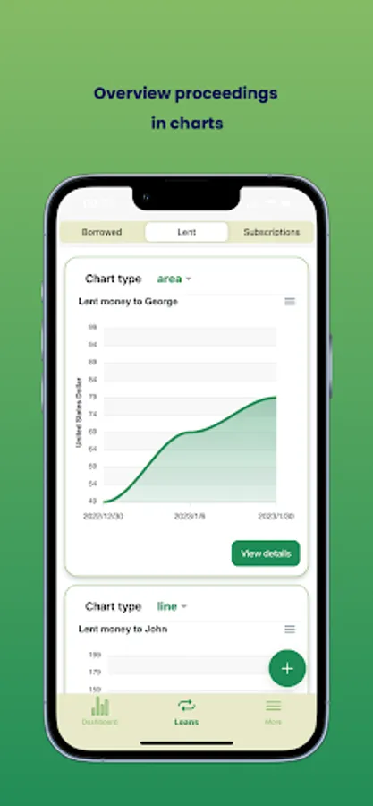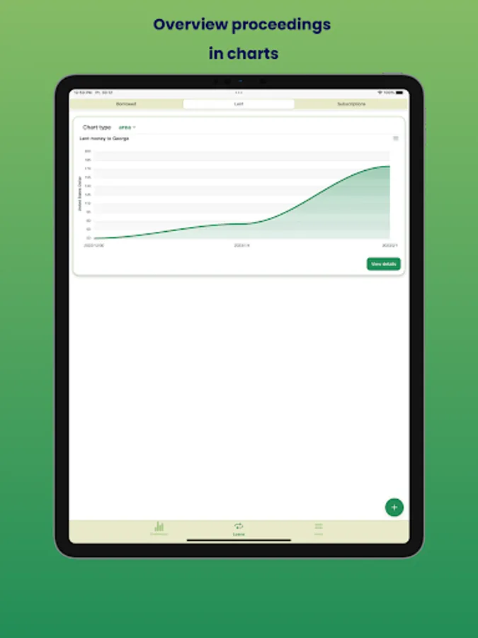 - keep track of money that you borrowed or lent by adding it to your list, then keeping track of how much you returned or received back. It goes with easy to read outlook and charts. Know your situation in a glimpse