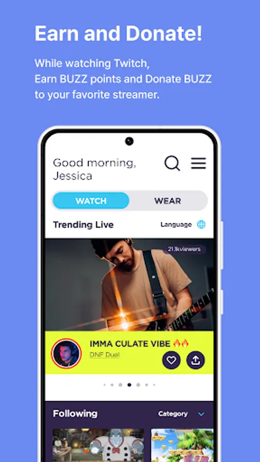 - Earn BUZZ points while watching content on Twitch, and Donate to your favorite streamer with BUZZ.