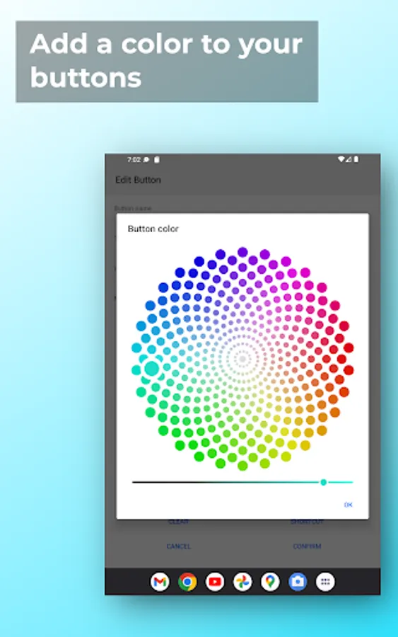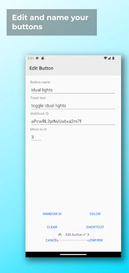 each "button" can be customized with a color, a text, and a short description upon activation which will appear as a toast notification