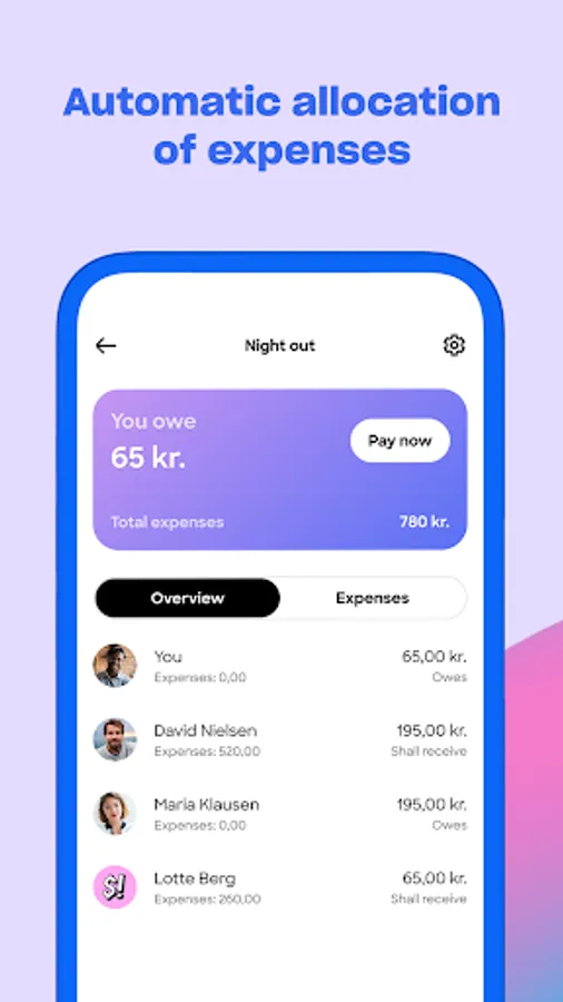 Enter your expenses in the app and pay each other back with a few clicks. You can always track how much you owe each other.