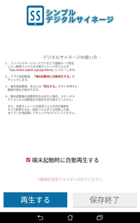 3.端末再起動後、あるいは「再生する」ボタンを押すと