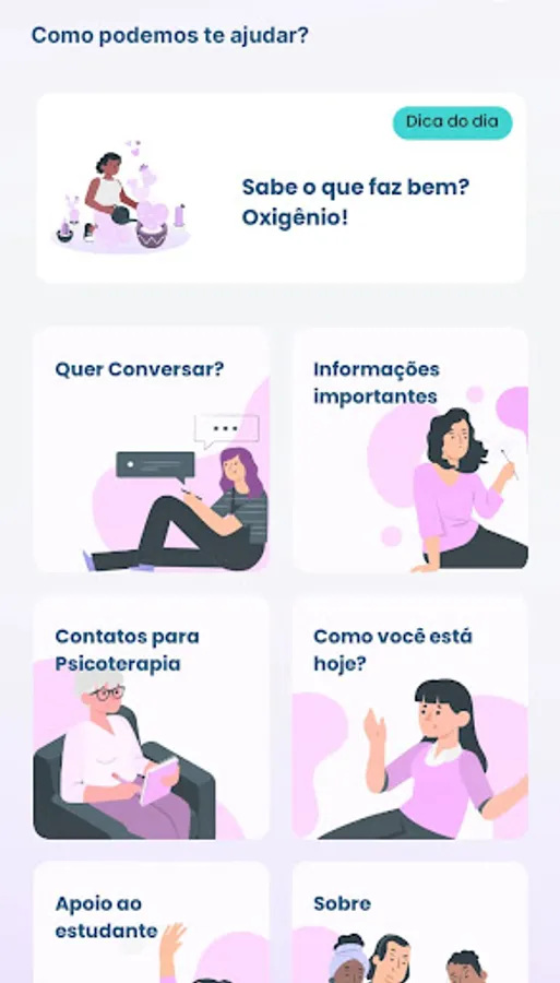 The Mais Um Dia app aims to promote preventive care and mental health literacy. This tool developed by the Federal University of Tocantins also offers guidance with health professionals, daily health tips, a screening test for symptoms of depression, anxiety and stress and information about services offered by UFT. This app is not for medical or diagnostic purposes.