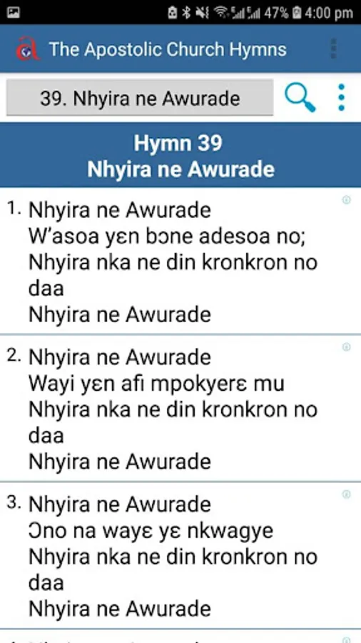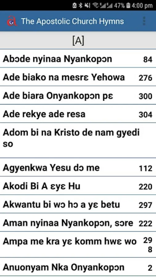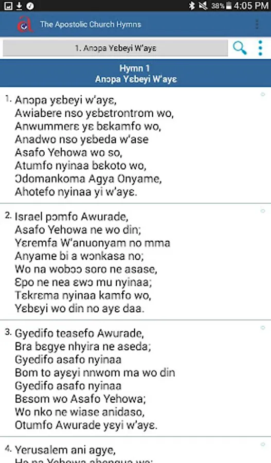 The Apostolic Hymns app contains over 300 twi hymns, Tenets, Rules of Conduct and Rules of Belief of The Apostolic Church-Ghana.