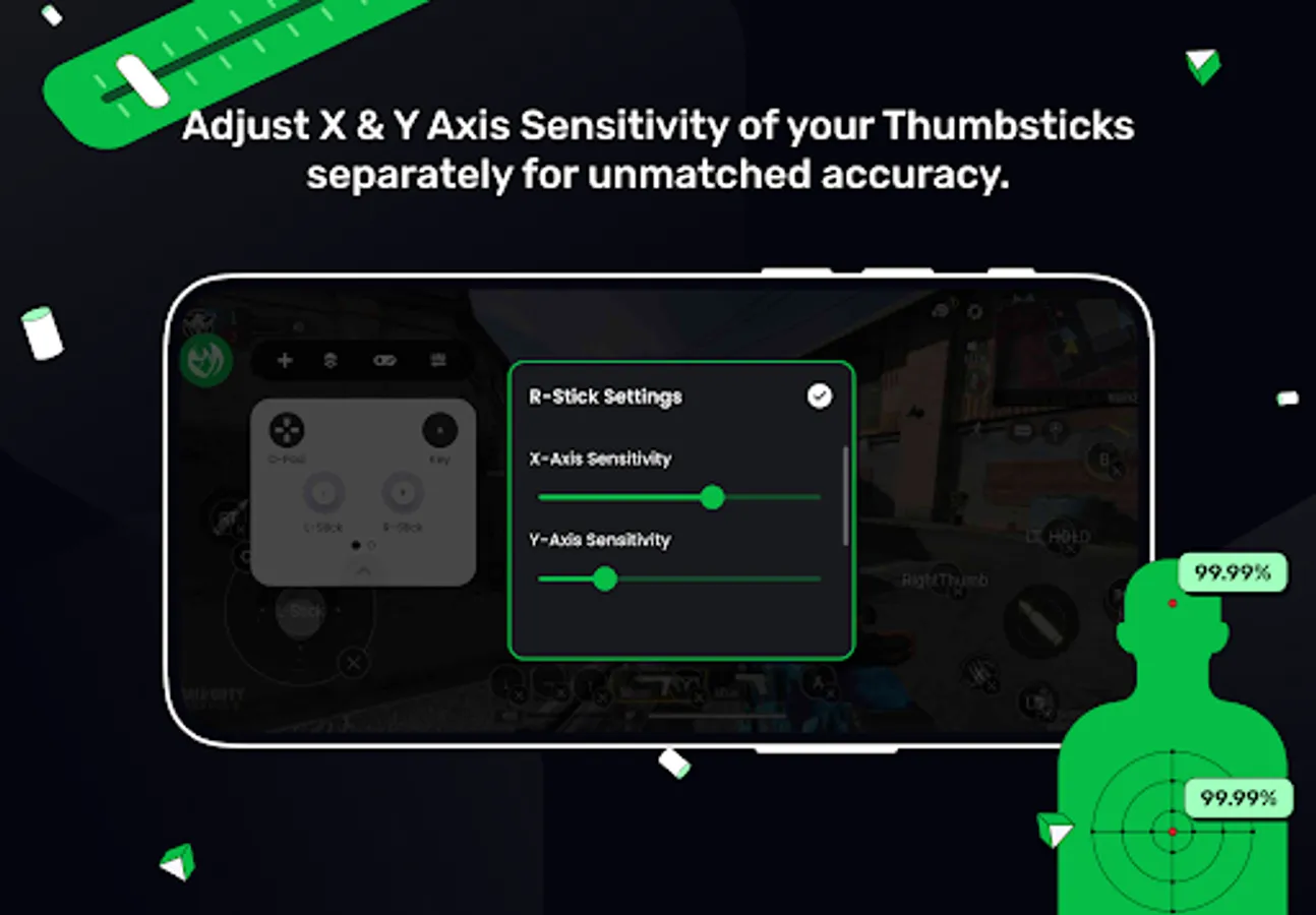 โ Separate X/Y Axis Camera Sensitivity ๐ท : Mantis gives you the option of changing the Vertical and Horizontal Sensitivity of your Thumbsticks separately, for better customization. Great for shooter games.