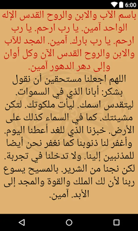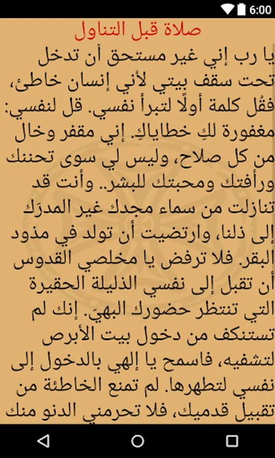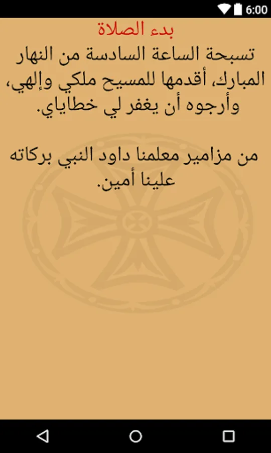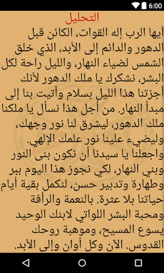 The Agpeia is read throughout the day and in many situations. The hours of the day start from sunrise and end at sunset. The morning prayer (Prime), which corresponds to 6 a.m., is said upon waking up in the morning or after the Midnight praise the previous night. The Terce (9 a.m.) and Sext (noon) hours are prayed before each liturgy during the Offering of Incense. The None (3 p.m.) hour is also read during fasting days. Vespers (sunset) and Compline (9 p.m.) are read in the early evening and before bedtime, respectively. and are both read before the Liturgy during the Lent and the fast of Nineveh. The Midnight hour is read just before the Midnight Praise. The Veil hour is reserved for priests, monks and bishops