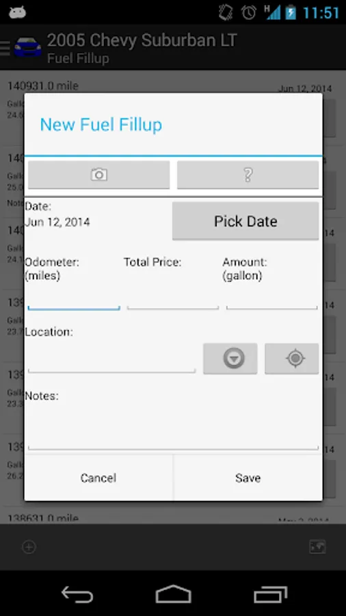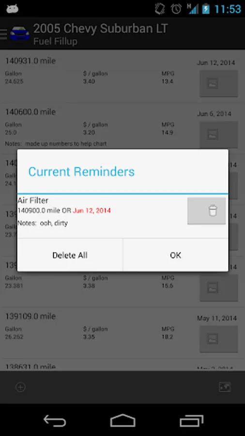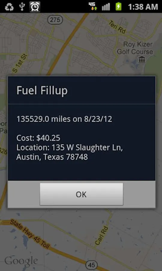 - View your various entries on a map complete with popups to tell you what the entry is. You can view everywhere you went on a trip, or see in what parts of town you filled up and more!