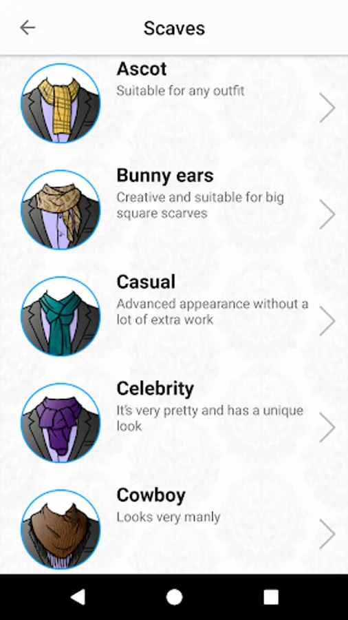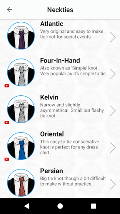 • Popular necktie knots (Windsor, For-in-Hand, Atlantic, Trinity, Persian, Oriental, Eldredge), bow ties, ascots, pocket square folds and men's scarves.