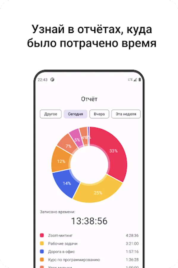 Reports and graphs will help you understand where time was spent per day, week, month or any other period.