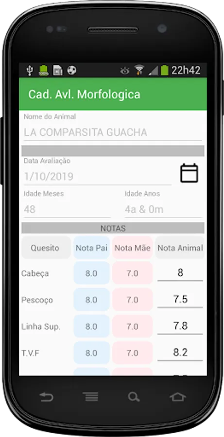 - Morphological Evaluation: allows the producer to record the morphological evaluation notes of the animal in matters such as: head, neck, upper line, T.V.F - Torax Ventre Flanco, plumbs, length and set. Allowing the farmer to make comparisons between animals by identifying breeders who convey the best traits to their offspring.