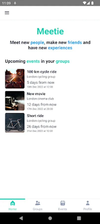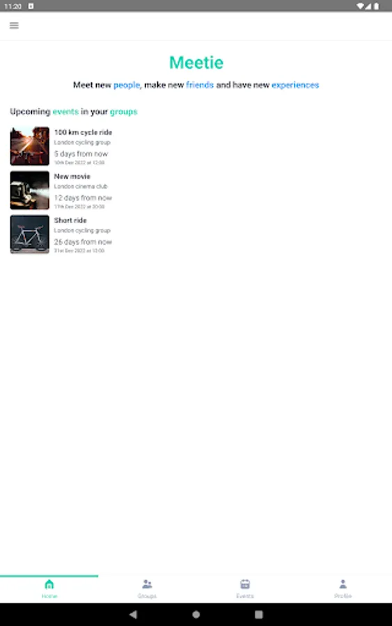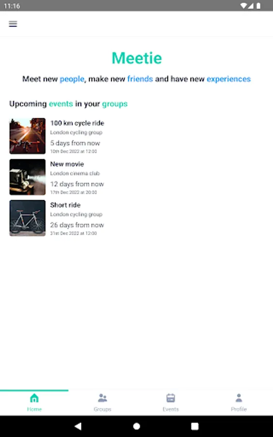 Meetie is an app where you can create groups and events related to your interests and meet new people, make new friends and have new experiences.