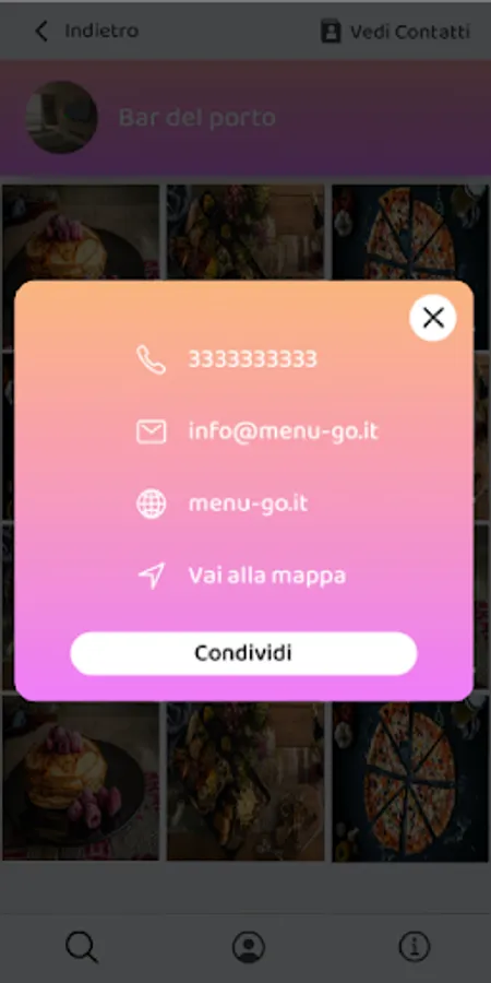 MenuGo allows you to browse digital menus and contact different activities around you such as restaurants, bars, pizzerias, sandwich shops etc. In a few touches you can load your personal menu and allow customers to contact you for orders! The digital menu is the future of any restaurant business, with MenuGo it's free and you can generate it independently!