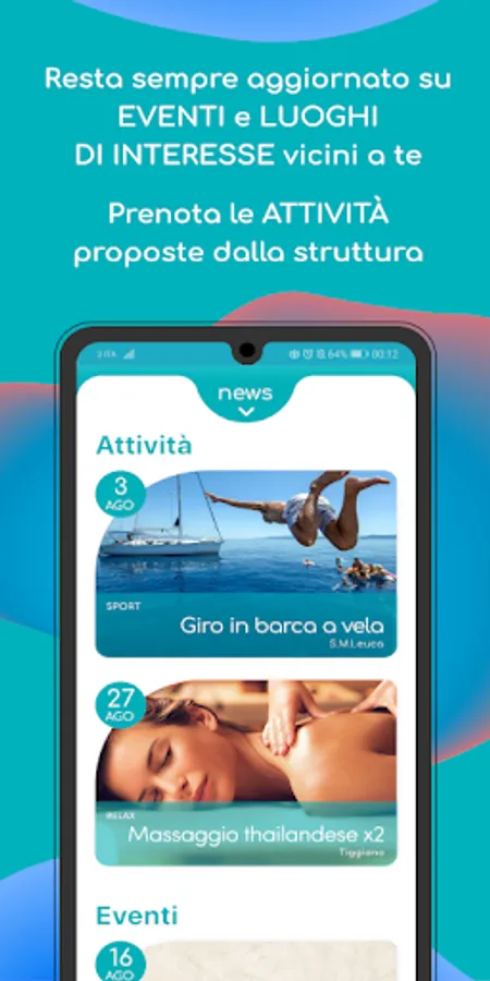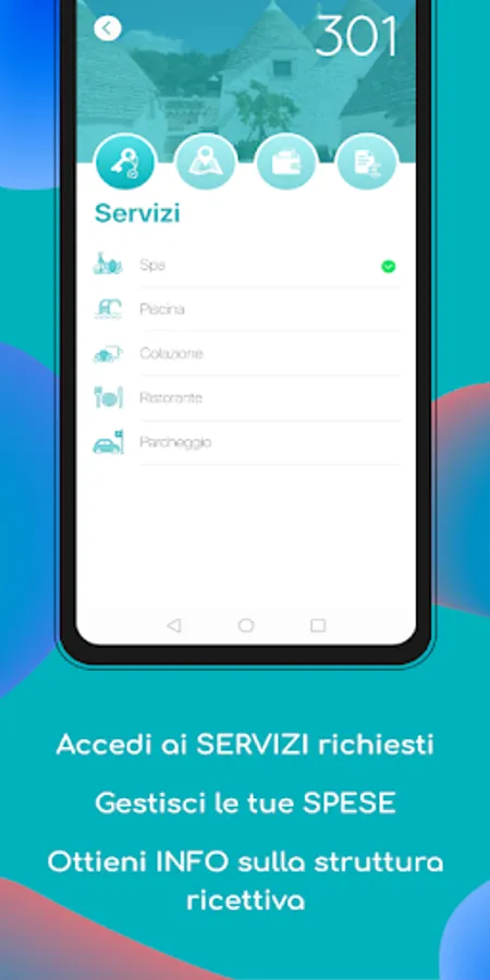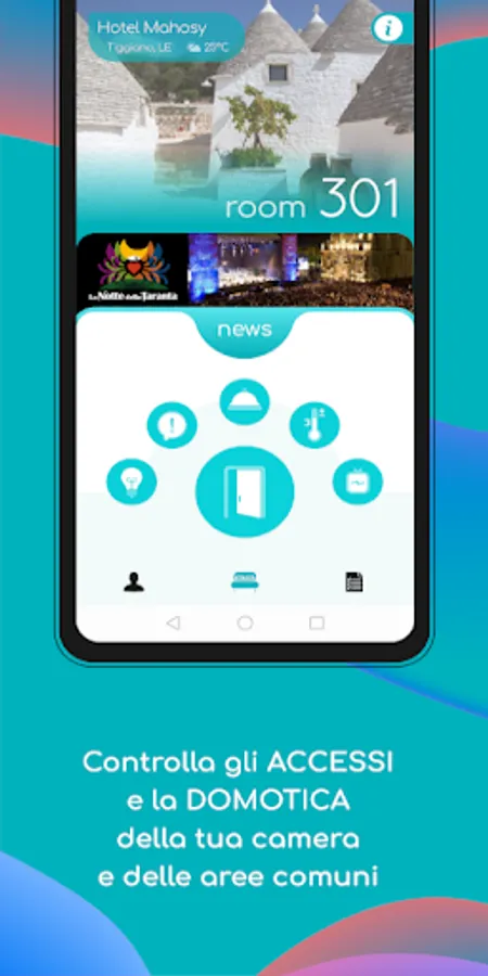 Downloadable for free, enables the guest in any accommodation (hotels, b&B..) to the online check-in, to manage the accesses in the building (hall, garage, room ..), room facilities (on site and remotely), communicate with the staff (require room services, report technical problems to the facilities and room amenities..), receive information about on-site activities and the area, write and send live feedbacks.