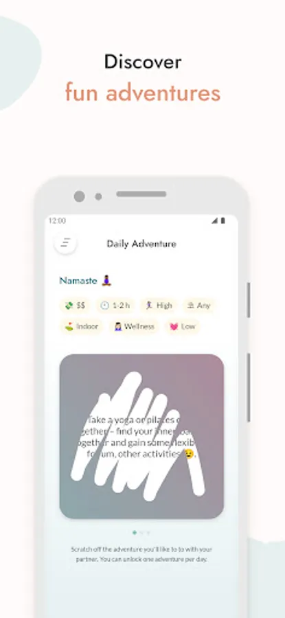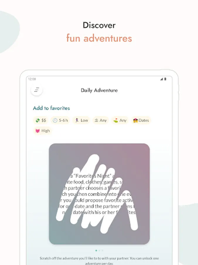 Discover cool adventure ideas to undertake together with your partner 🏔. With this feature, you won't run out of ideas for your next date. Simply scratch off an adventure you might like, save it for later or do it now! Don't forget to take some pictures of those funny moments.