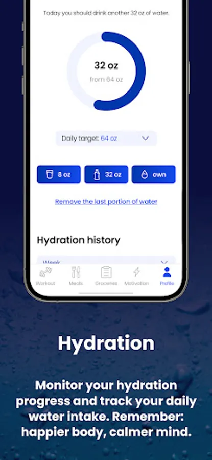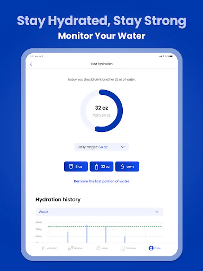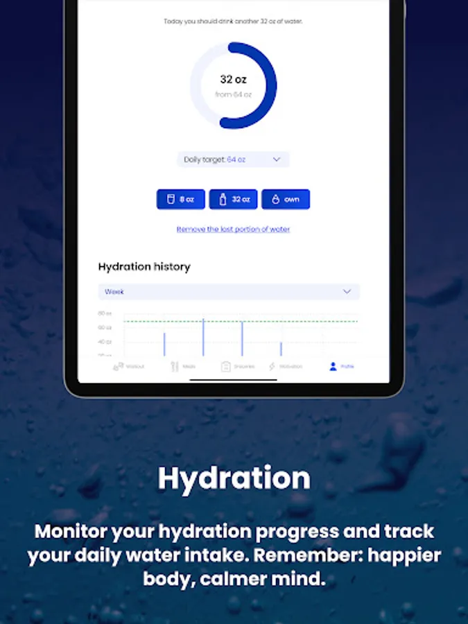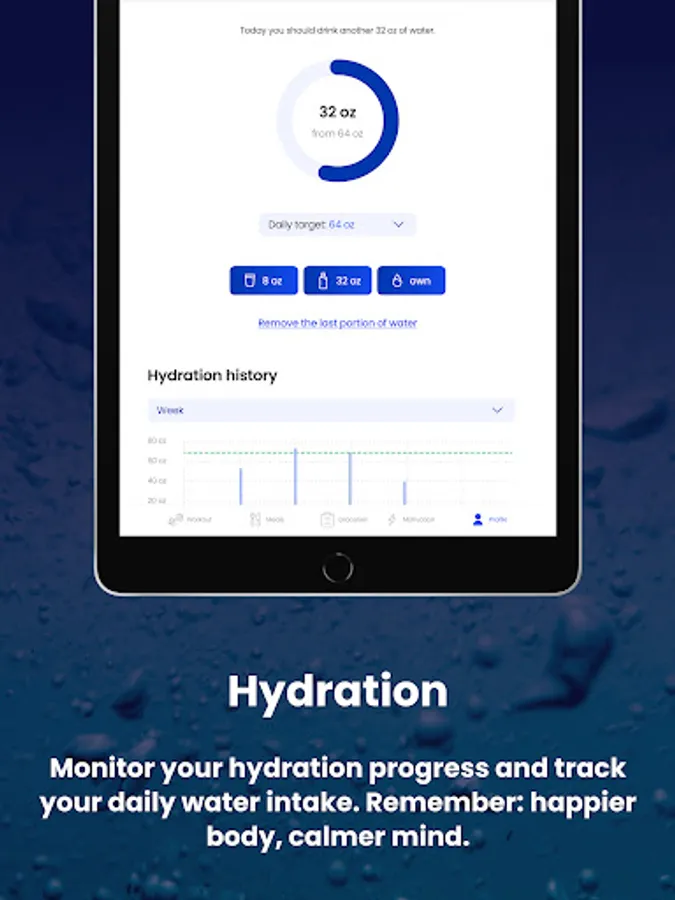- Track your progress, achievements, hydration levels.