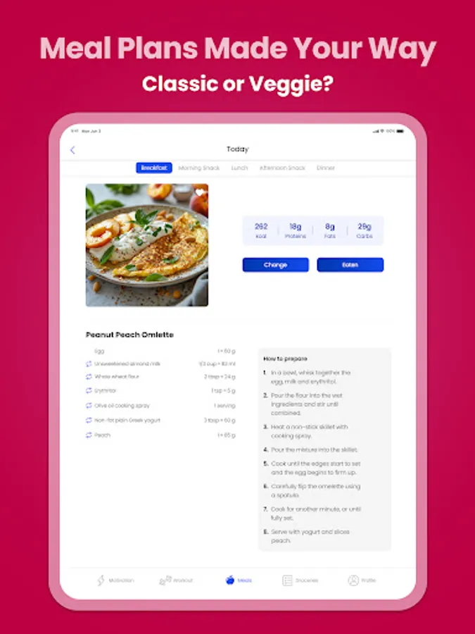 My app doesn’t stop with home exercises, I also have a special feature that will help put together a personalized meal plan just for you, whether your fitness goal is to lose weight, tone up or maintain your current weight.