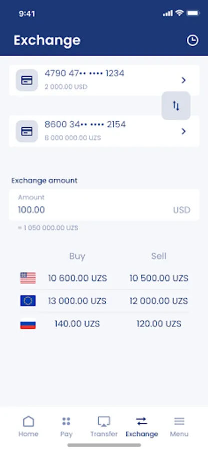 • make reverse conversion from FCY accounts; VISA, FCY demand deposit, and FCY wallet to UzCard, UZS demand deposit or wallet accounts;